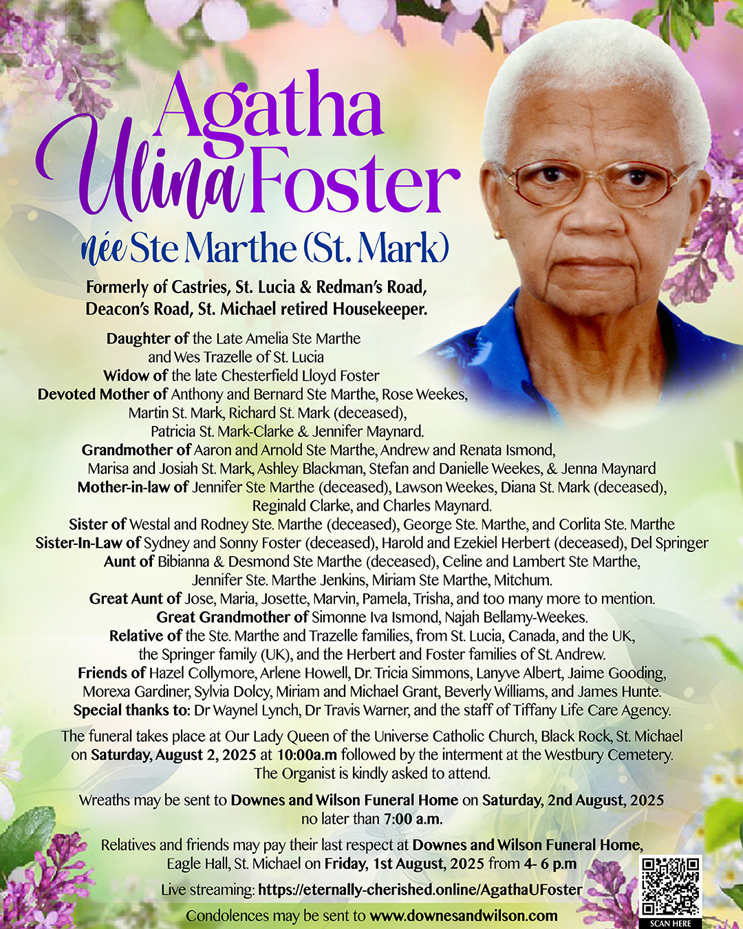 AGATHA ULINA FOSTER née Ste Marthe (St. Mark) Formerly of Castries, St. Lucia & Redman’s Road, Deacon’s Road, St. Michael retired Housekeeper.