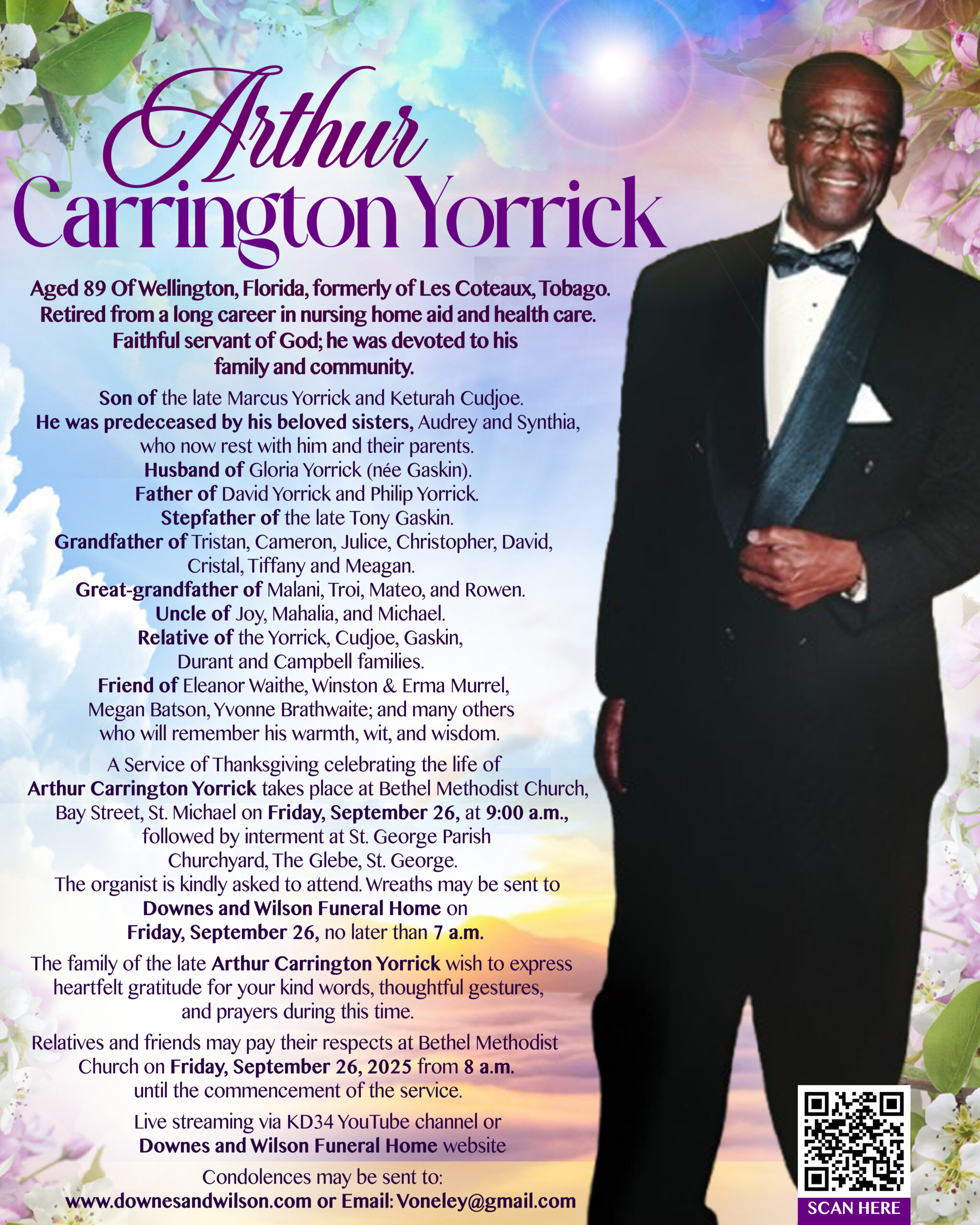 A Service of Thanksgiving celebrating the life of Arthur Carrington Yorrick takes place at Bethel Methodist Church, Bay Street, St. Michael on Friday, September 26, 2025, at 9 a.m., followed by interment at St. George Parish Churchyard, The Glebe, St. George.