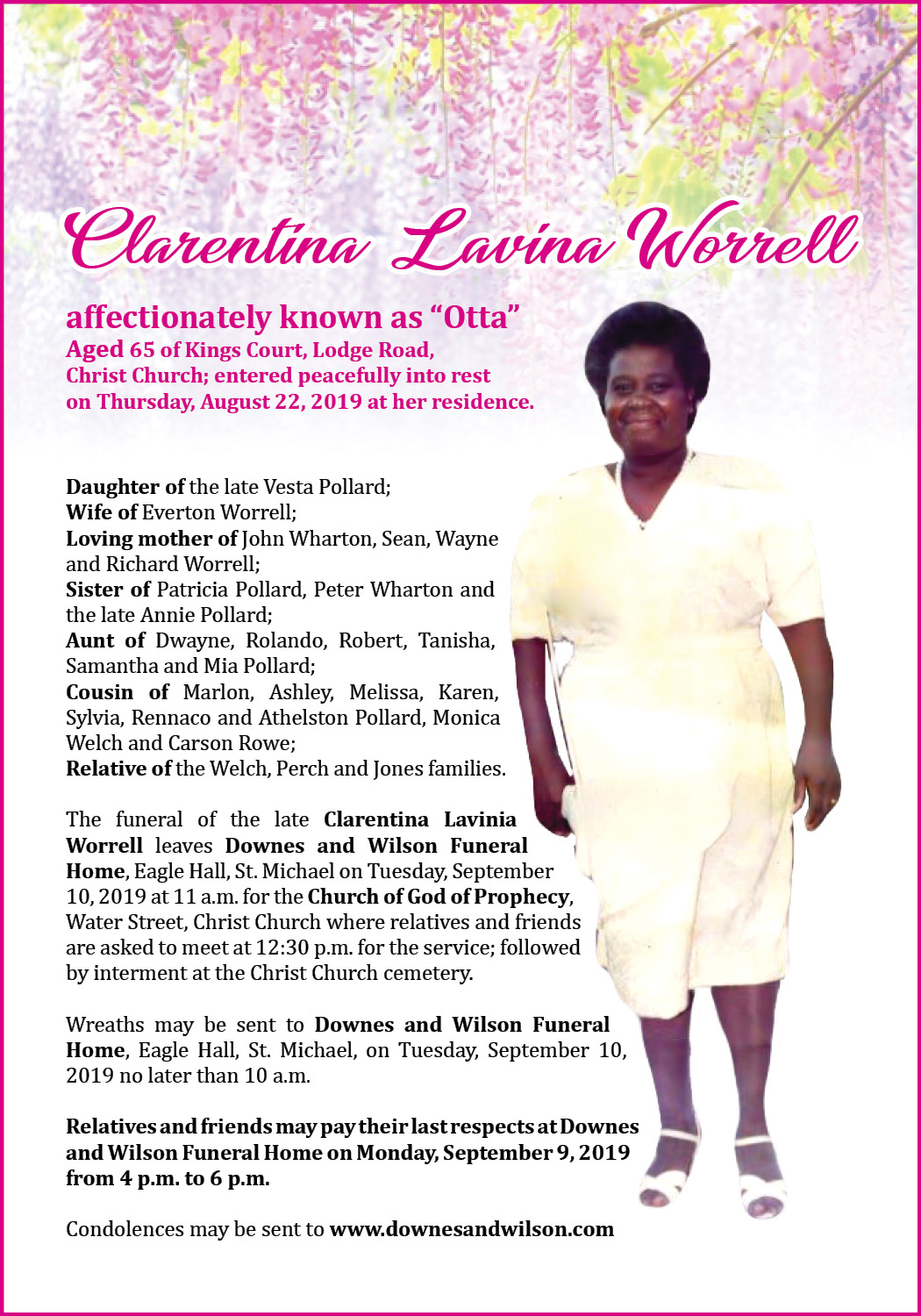 The funeral of the late Clarentina Lavinia Worrell leaves Downes and Wilson Funeral Home, Eagle Hall, St. Michael on Tuesday, September 10, 2019 at 11 a.m. for the Church of God of Prophecy, Water Street, Christ Church where relatives and friends are asked to meet at 12:30 p.m. for the service; followed by interment at the Christ Church cemetery.