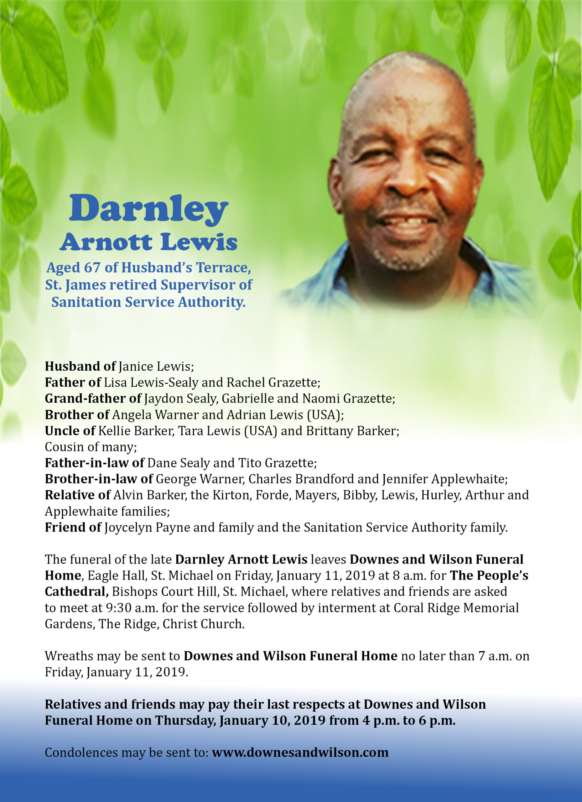 DARNLEY ARNOTT LEWIS aged 67 of Husband’s Terrace, St James retired Supervisor of Sanitation Service Authority.