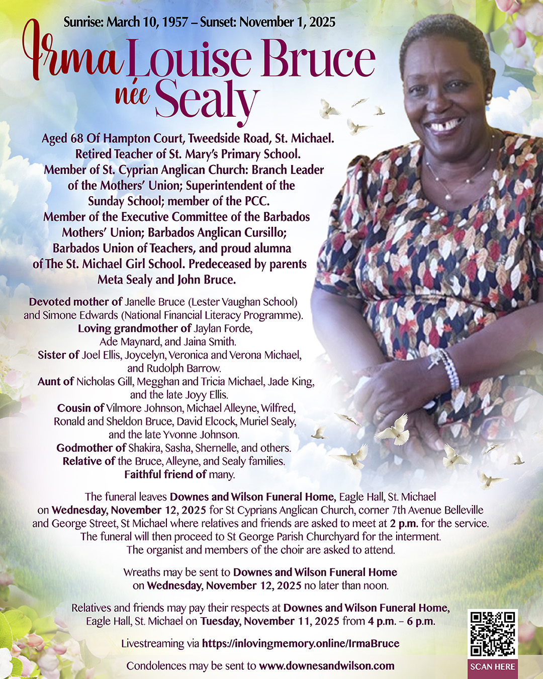 The funeral leaves Downes and Wilson Funeral Home, Eagle Hall, St. Michael on Wednesday, November 12, 2025 for St Cyprians Anglican Church, corner 7th Avenue Belleville and George Street, St Michael where relatives and friends are asked to meet at 2 p.m. for the service.