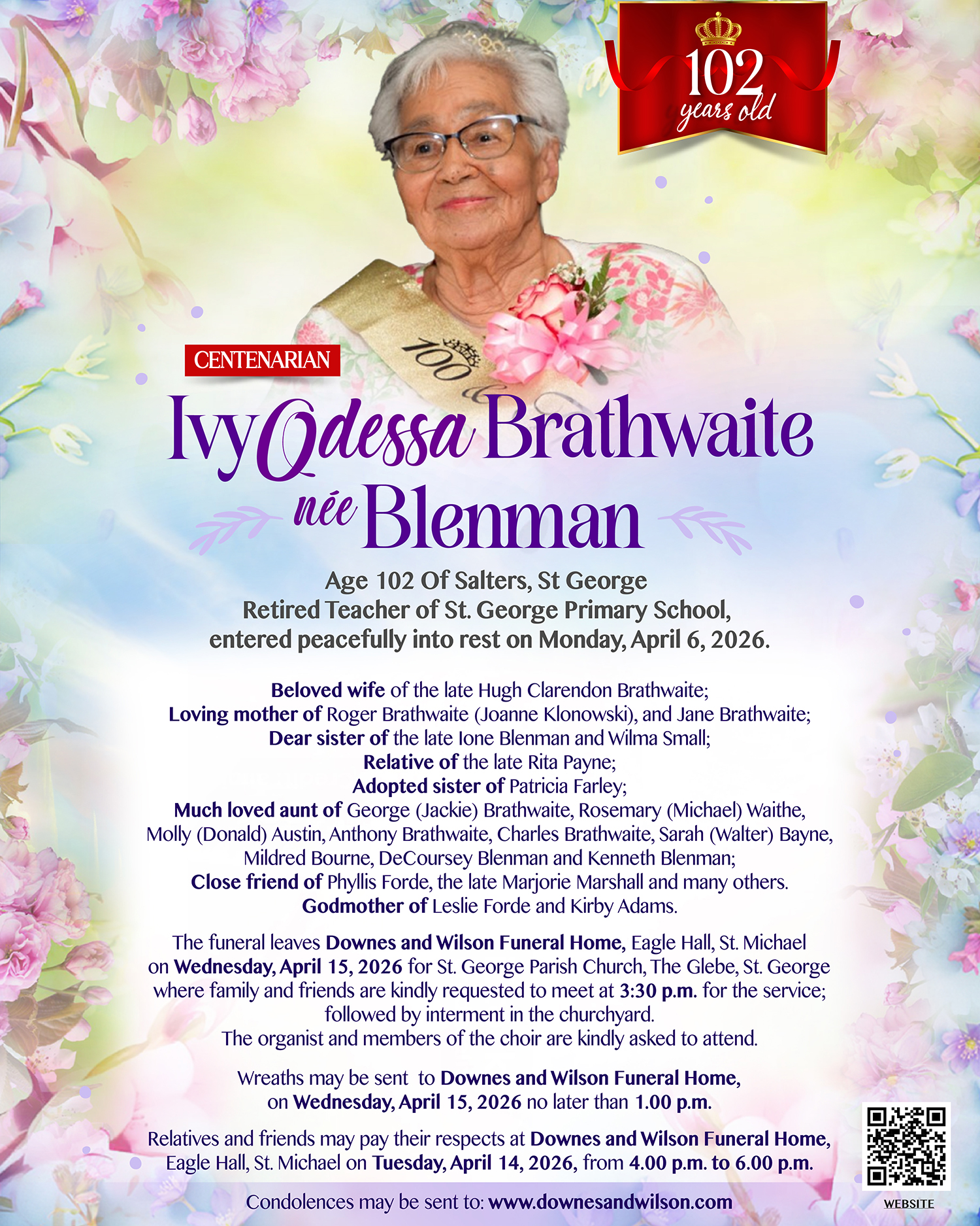 The funeral leaves Downes and Wilson Funeral Home, Eagle Hall, St. Michael on Wednesday, April 15, 2026 for St. George Parish Church, The Glebe, St. George where family and friends are kindly requested to meet at 3:30 p.m. for the service; followed by interment in the churchyard.