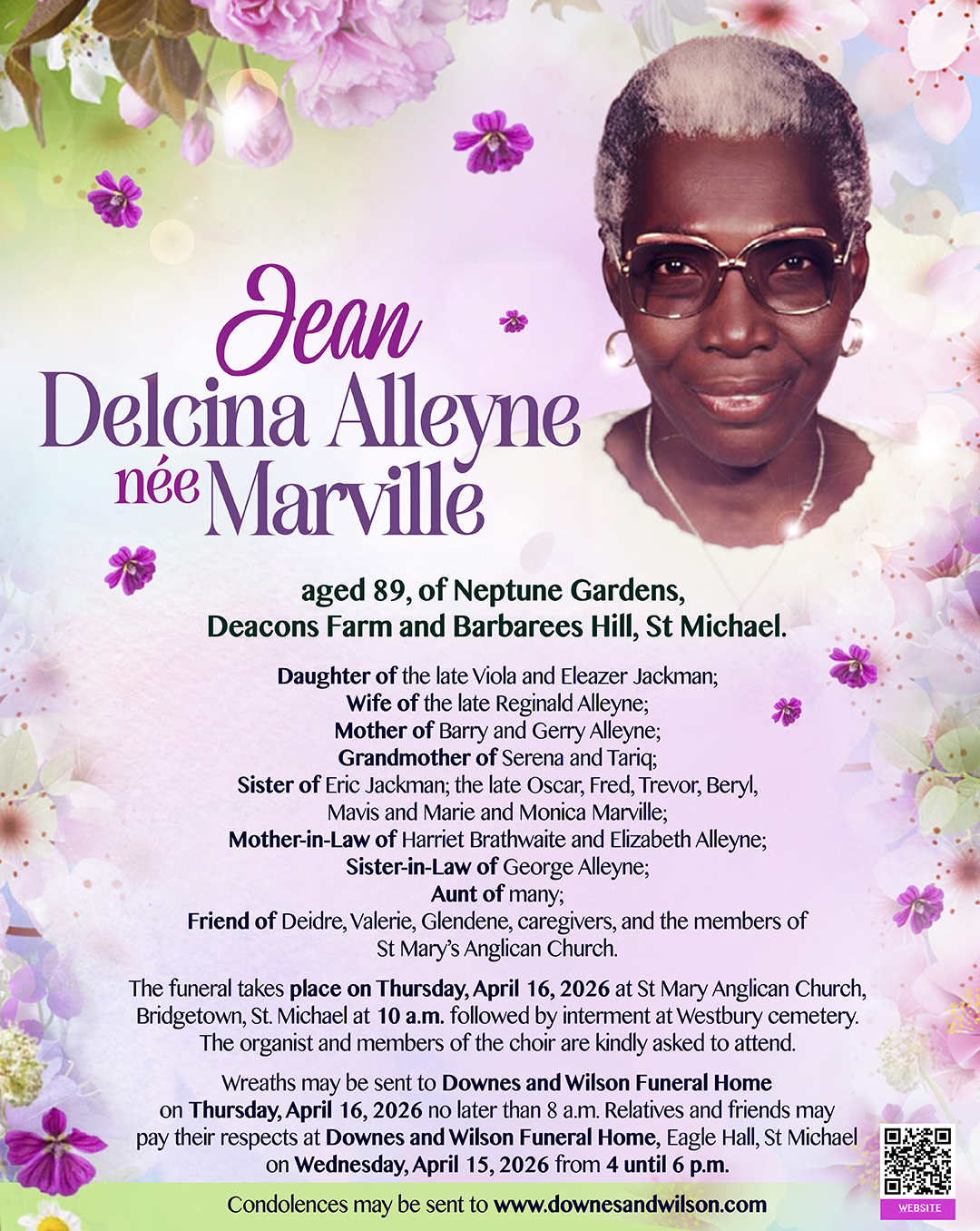 Alleyne née Marville: Jean Delcina, aged 89, of Neptune Gardens, Deacons Farm and Barbarees Hill, St Michael.