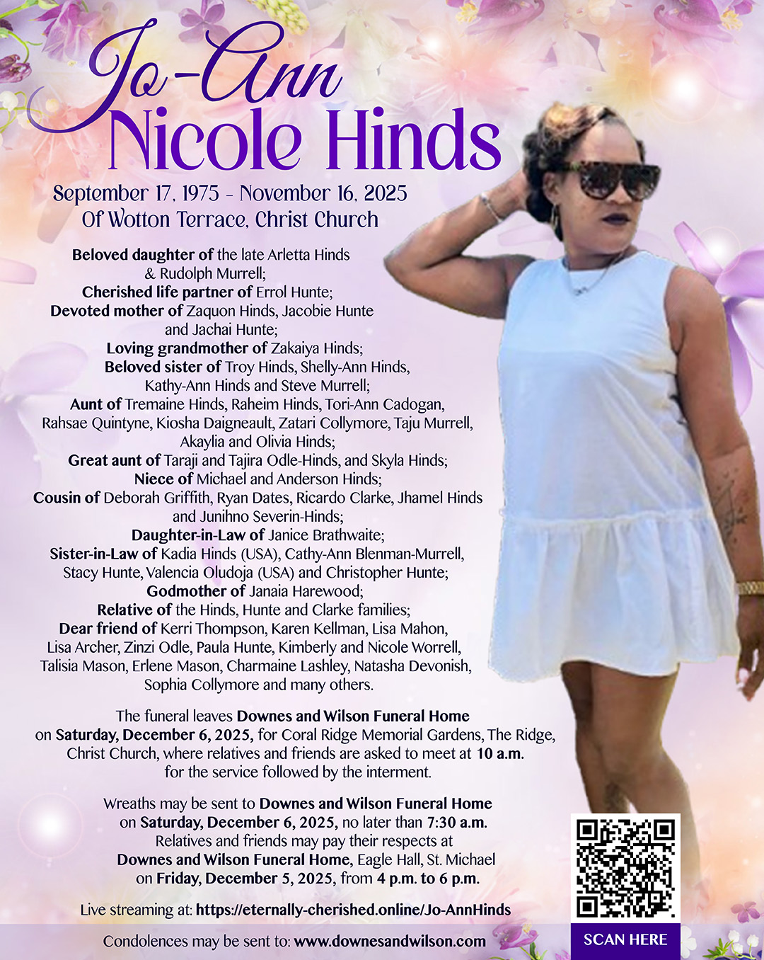 The funeral leaves Downes and Wilson Funeral Home on Saturday, December 6, 2025, for Coral Ridge Memorial Gardens, The Ridge, Christ Church, where relatives and friends are asked to meet at 10 a.m. for the service followed by the interment.