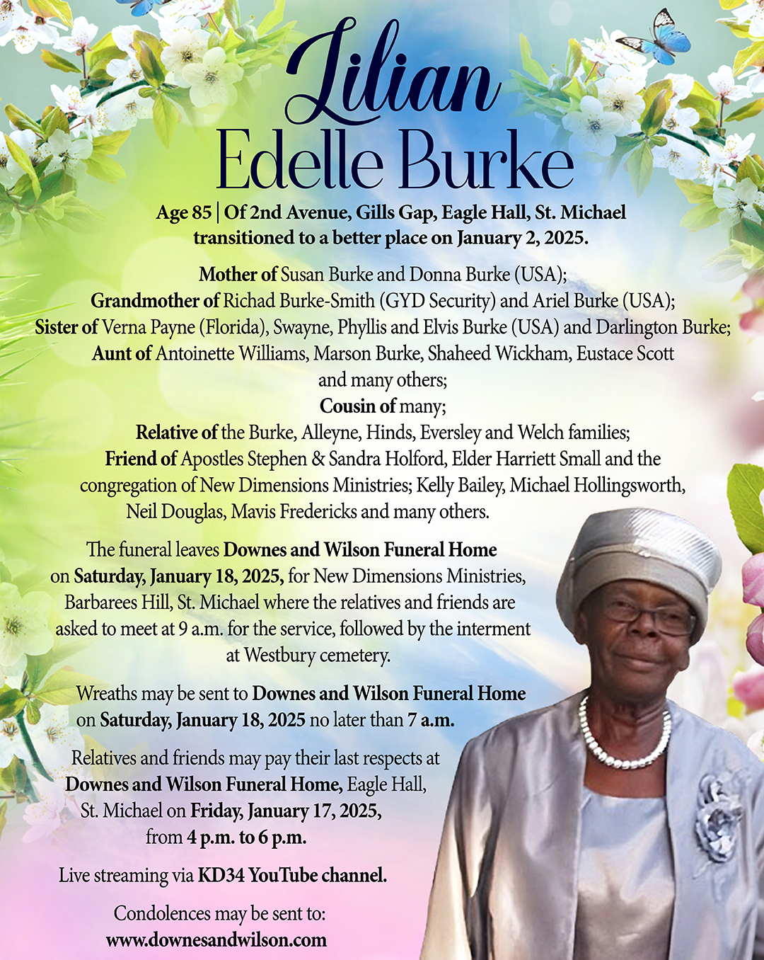 The funeral leaves Downes and Wilson Funeral Home on Saturday, January 18, 2025, for New Dimensions Ministries, Barbarees Hill, St. Michael where the relatives and friends are asked to meet at 9 a.m. for the service, followed by the interment at Westbury cemetery.