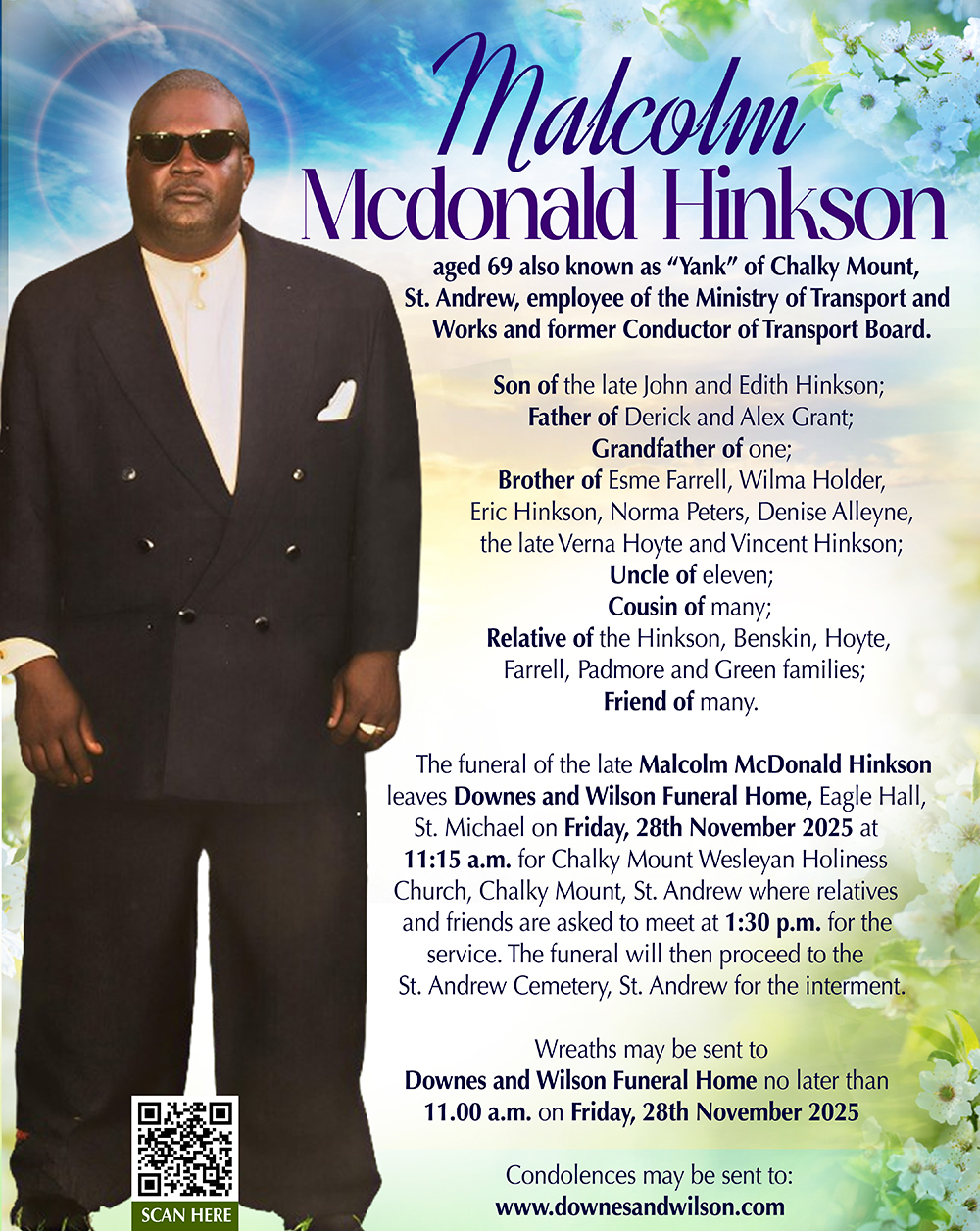 The funeral of the late MALCOLM McDonald HINKSON leaves Downes and Wilson Funeral Home Eagle Hall, St. Michael on Friday, 28th November 2025 at 11:15 a.m. for Chalky Mount Wesleyan Holiness Church, Chalky Mount, St. Andrew where relatives and friends are asked to meet at 1:30 p.m. for the service. The funeral will then proceed to the St. Andrew Cemetery, St. Andrew for the interment.