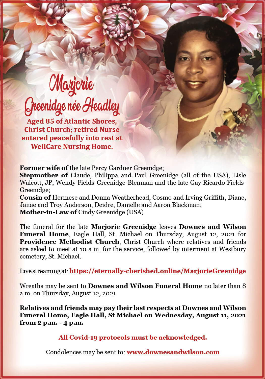The funeral for the late Marjorie Greenidge leaves Downes and Wilson Funeral Home, Eagle Hall, St. Michael on Thursday, August 12, 2021 for Providence Methodist Church, Christ Church where relatives and friends are asked to meet at 10 a.m. for the service, followed by interment at Westbury cemetery, St. Michael.