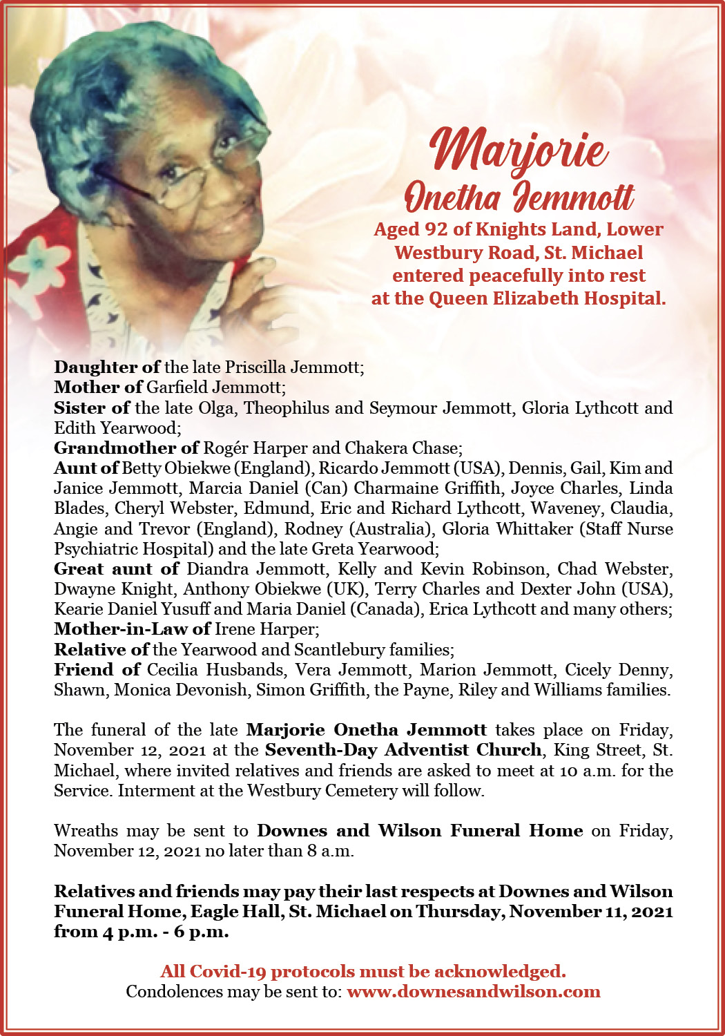 The funeral of the late Marjorie Onetha Jemmott takes place on Friday, November 12, 2021 at the Seventh-Day Adventist Church, King Street, St. Michael, where invited relatives and friends are asked to meet at 10 a.m. for the Service. Interment at the Westbury Cemetery will follow.