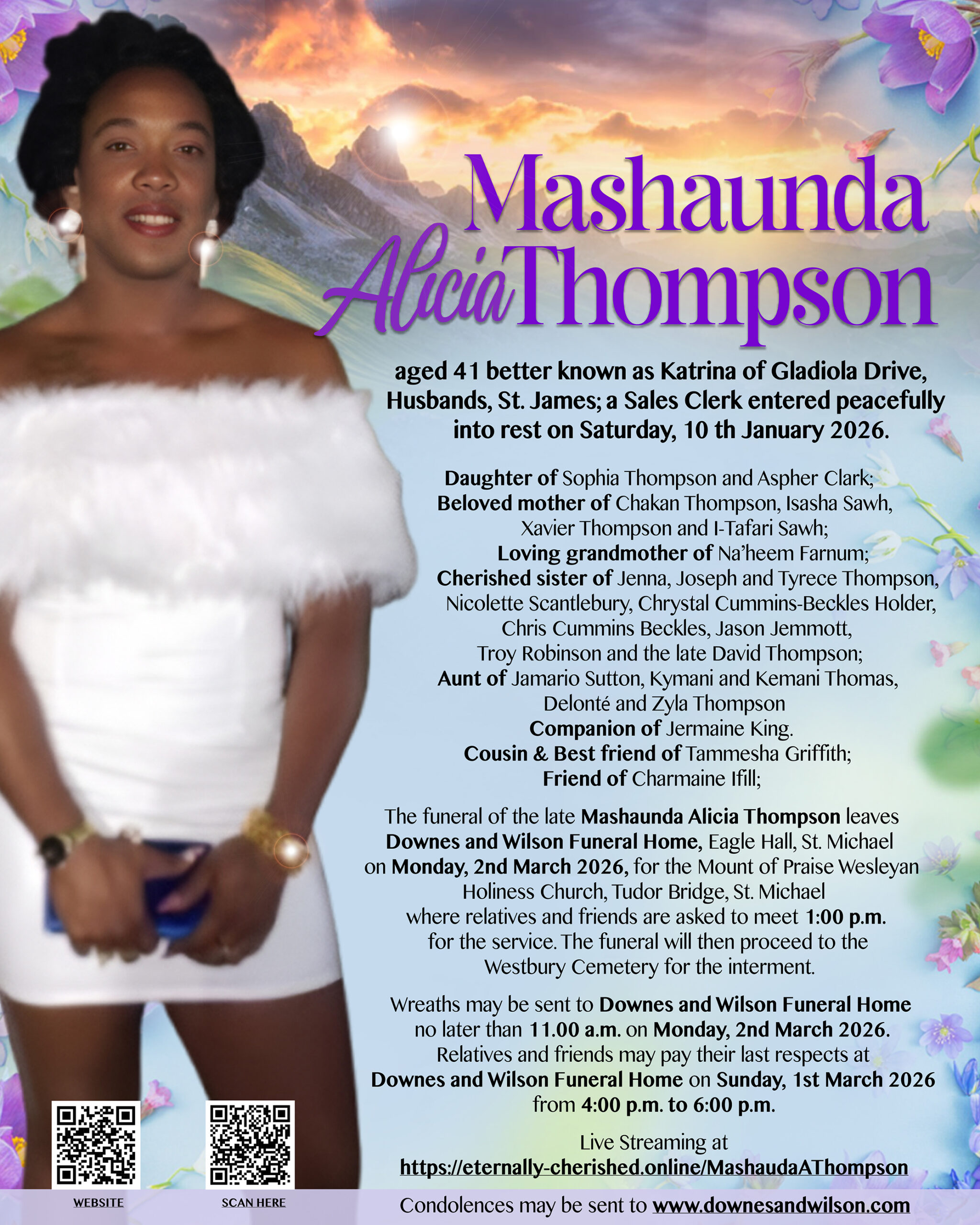The funeral of the late Mashaunda Alicia Thompson leaves Downes and Wilson Funeral Home, Eagle Hall, St. Michael on Monday, 2nd March 2026, for the Mount of Praise Wesleyan Holiness Church, Tudor Bridge, St. Michael where relatives and friends are asked to meet 1:00 p.m. for the service. The funeral will then proceed to the Westbury Cemetery for the interment.