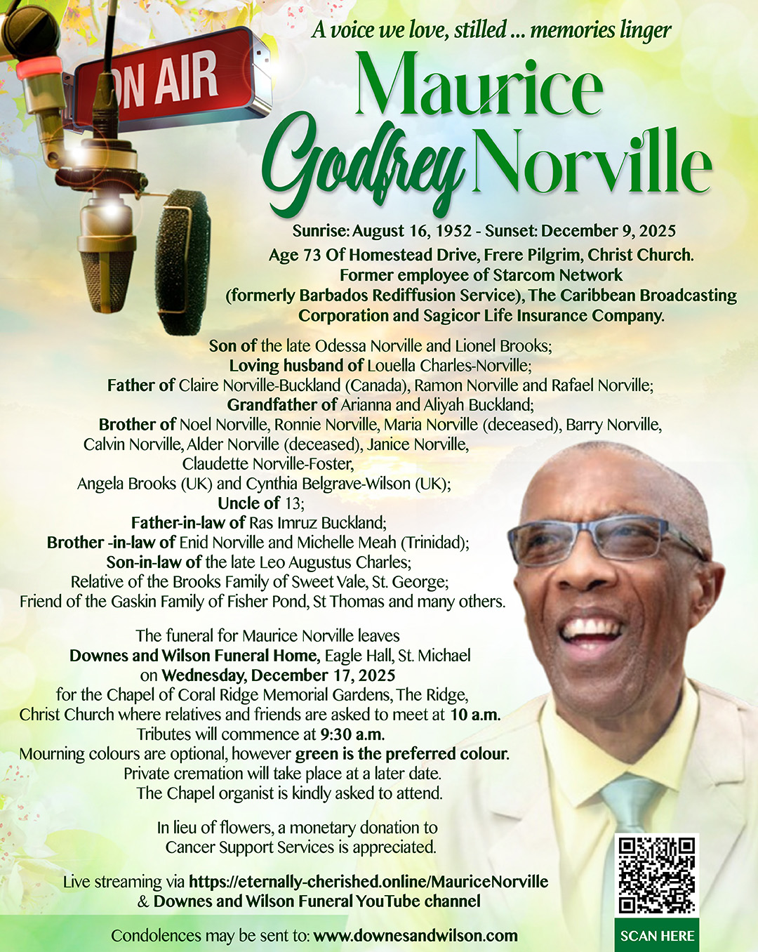 The funeral for Maurice Norville leaves Downes and Wilson Funeral Home, Eagle Hall, St. Michael on Wednesday, December 17, 2025 for the Chapel of Coral Ridge Memorial Gardens, The Ridge, Christ Church where relatives and friends are asked to meet at 10 a.m.