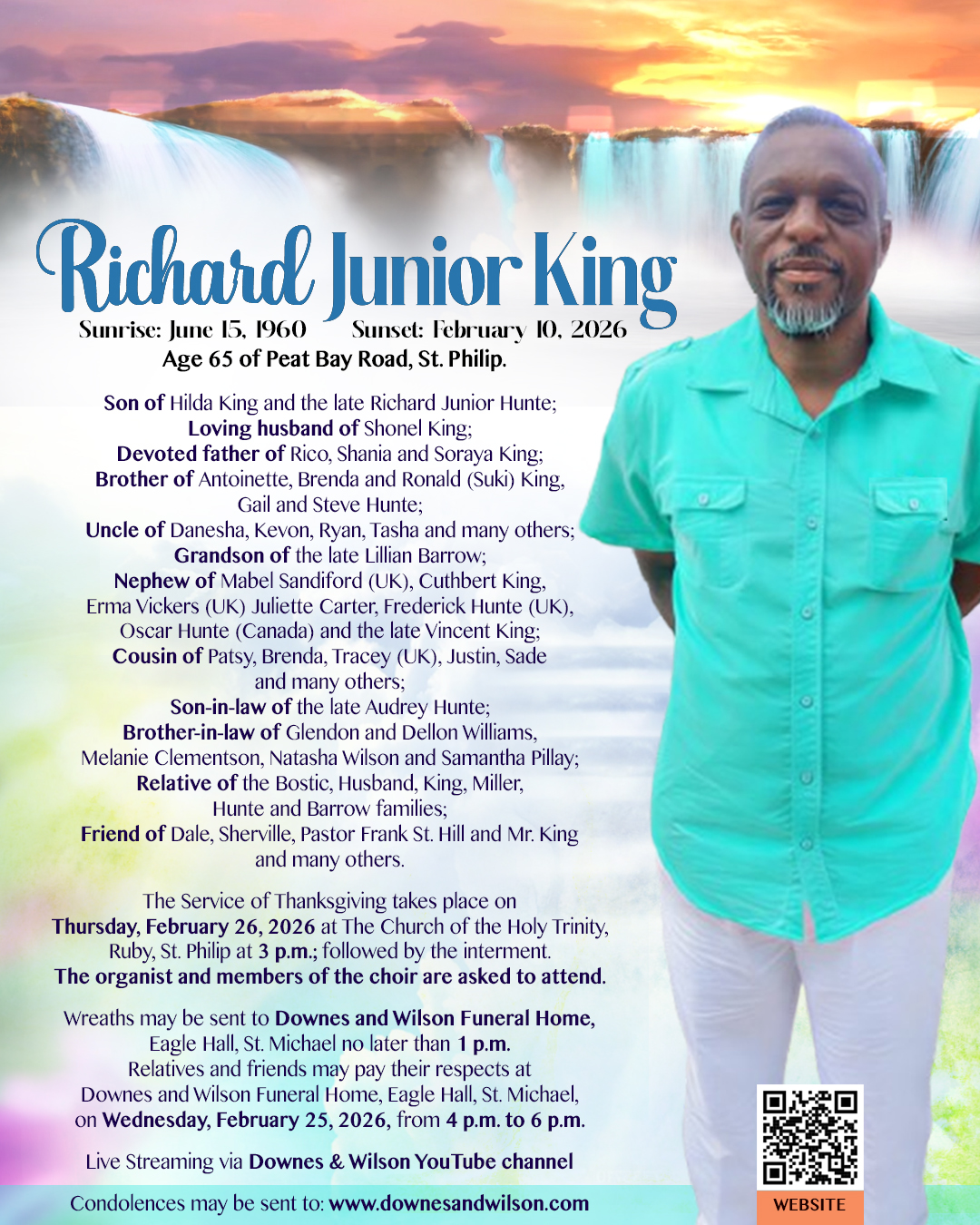 Relatives and friends may pay their respects at Downes and Wilson Funeral Home, Eagle Hall, St. Michael, on Wednesday, February 25, 2026, from 4 p.m. to 6 p.m.