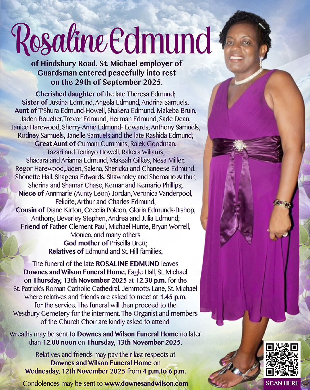 The funeral of the late ROSALINE EDMUND leaves Downes and Wilson Funeral Home Eagle Hall, St. Michael on Thursday, 13th November 2025 at 12.30 p.m. for the St. Patrick’s Roman Catholic Cathedral, Jemmotts Lane, St. Michael where relatives and friends are asked to meet at 1.45 p.m. for the service. The funeral will then proceed to the Westbury Cemetery for the interment.