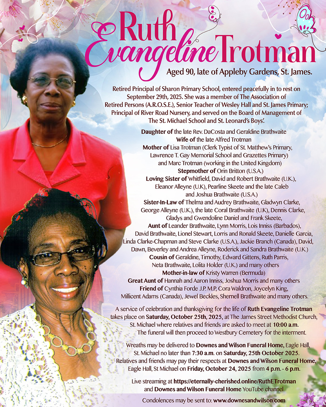 A service of celebration and thanksgiving for the life of Ruth Evangeline Trotman takes place on Saturday, October 25th, 2025, at The James Street Methodist Church, St. Michael where relatives and friends are asked to meet at 10:00 a.m.