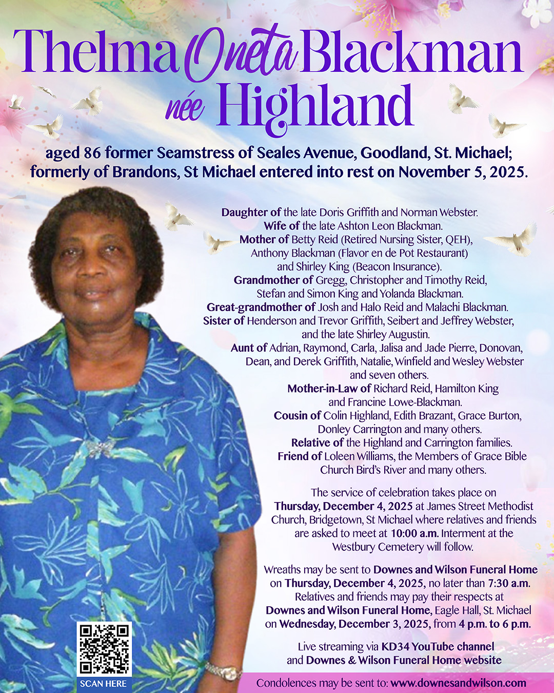 Blackman née Highland: Thelma Oneta, aged 86 former Seamstress of Seales Avenue, Goodland, St. Michael; formerly of Brandons, St Michael entered into rest on November 5, 2025.